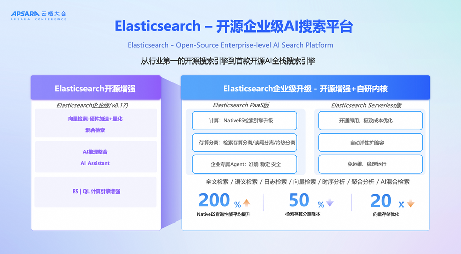 - 引擎加速:NativeES 引擎支持检索性能提升2倍至6倍;检索存算分离降本50%;向量检索内存优化20倍。