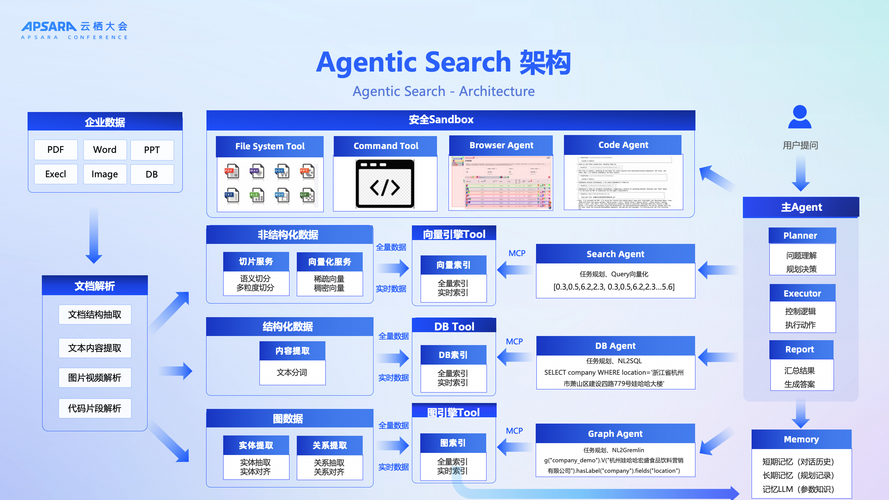 演讲中邢少敏详细阐释了阿里云AI搜索的核心突破——Agentic Search 架构创新。该架构通过多 Agent 协同、多模态数据处理与任务自主规划,构建了从“问题提出”到“方案自主生成”的智能闭环。
