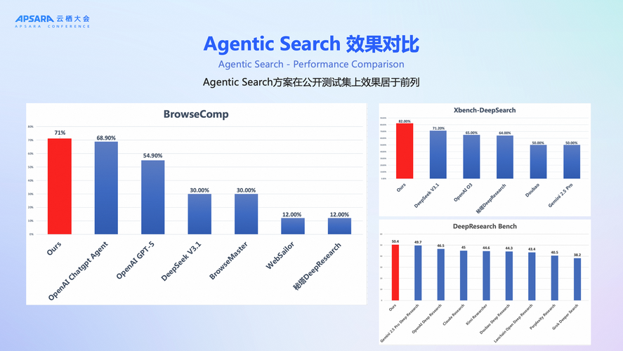 - 权威测试领先:在 OpenAI 的 BrowseComp 、红杉中国Xbench-DeepSearch以及Deep Research Bench评测集中,Agentic Search 评测指标均超越 Gemini、OpenAI 等国际主流方案,排名第一。