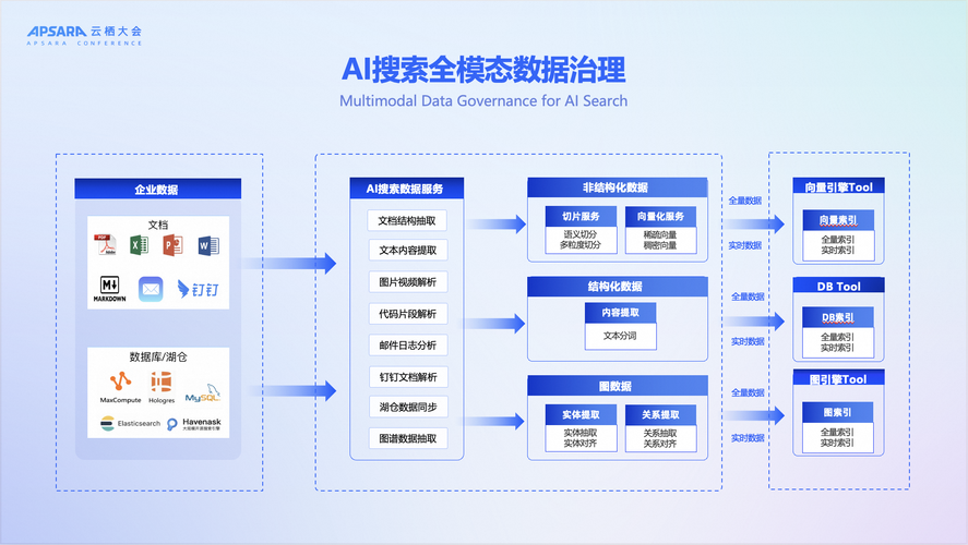 全模态数据治理:从文档、数据库到湖仓的多源数据,通过文档结构抽取、实体关系建模,实现非结构化数据到向量数据、知识图谱的转化,为多模态搜索提供实时索引能力。
