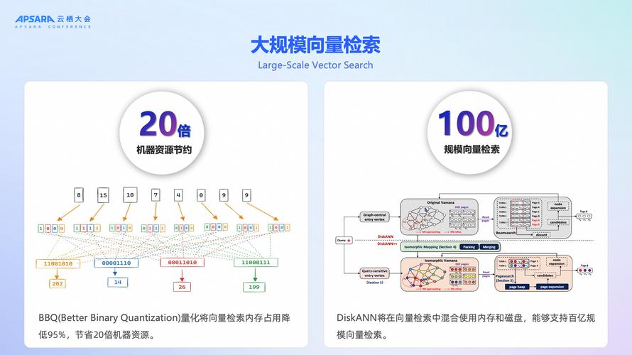 向量检索进化:向量检索 GPU 加速,基于 GPU 卡的索引构建性能提升13倍,资源成本下降5倍;结合 BBQ 量化技术,内存占用降低95%,节省20倍机器资源;基于DiskANN技术,低成本支持百亿规模向量检索;