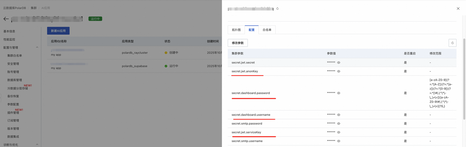 service-role-key、anon-key、dashboard-username、dashboard-password可以在PolarDB Supabase实例配置页找到: