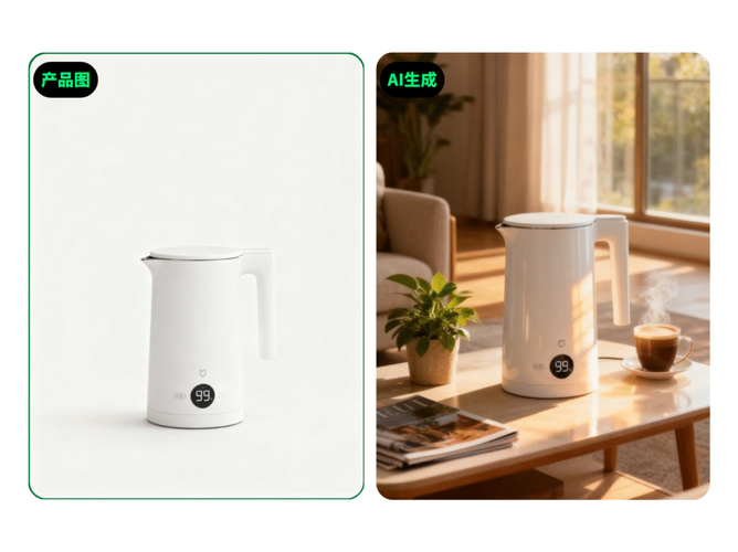 - 输入“灵感咒语”,如“把图1的产品放置到图2中间合适的位置,然后根据产品的类型增加其他场景元素,适合天猫电商大促”“双十一促销场景,红色主色调,小家电放在厨房台面上,突出产品节能卖点”;