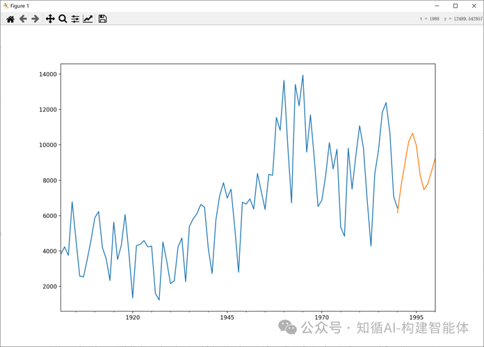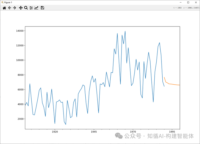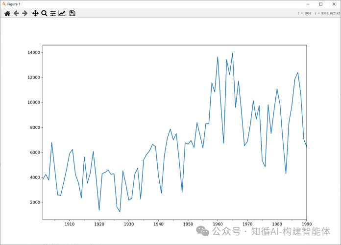 # 使用ARMA模型进行时间序列预测 import pandas as pd # 数据处理库 import matplotlib.pyplot as plt # 绘图库 import statsmodels.api as sm # 统计模型库 # 使用新的ARIMA模块替代已弃用的ARMA(ARIMA(p,0,q)等价于ARMA(p,q)) from statsmodels.tsa.arima.model import ARIMA # ARIMA模型 from statsmodels.graphics.api import qqplot # Q-Q图绘制工具 # 创建时间序列数据(这里是一组示例数据) data = [3821, 4236, 3758, 6783, 4664, 2589, 2538, 3542, 4626, 5886, 6233, 4199, 3561, 2335, 5636, 3524, 4327, 6064, 3912, 1356, 4305, 4379, 4592, 4233, 4281, 1613, 1233, 4514, 3431, 2159, 2322, 4239, 4733, 2268, 5397, 5821, 6115, 6631, 6474, 4134, 2728, 5753, 7130, 7860, 6991, 7499, 5301, 2808, 6755, 6658, 6944, 6372, 8380, 7366, 6352, 8333, 8281, 11548, 10823, 13642, 9973, 6723, 13416, 12205, 13942, 9590, 11693, 9276, 6519, 6863, 8237, 10122, 8646, 9749, 5346, 4836, 9806, 7502, 9387, 11078, 9832, 6886, 4285, 8351, 9725, 11844, 12387, 10666, 7072, 6429] # 将数据转换为Pandas Series对象,便于时间序列分析 data = pd.Series(data) # 为数据创建时间索引(从1901年到1990年,共90个年份) data_index = sm.tsa.datetools.dates_from_range('1901','1990') #print(data_index) # 可以打印查看生成的时间索引 # 将时间索引分配给数据 data.index = pd.Index(data_index) # 绘制原始数据图,设置图形大小 data.plot(figsize=(12,8)) plt.title('Original Time Series Data (1901-1990)') # 添加标题 plt.ylabel('Value') # 添加y轴标签 plt.xlabel('Year') # 添加x轴标签 plt.show() # 显示图形 # 创建ARIMA模型,使用order=(7,0,0)表示ARMA(7,0)模型 # 参数说明:p=7(自回归阶数), d=0(差分阶数), q=0(移动平均阶数) arma = ARIMA(data, order=(7,0,0)).fit() # 拟合模型 # 打印模型的AIC值(赤池信息准则,用于模型选择,越小越好) print('AIC: %0.4lf' %arma.aic) # 使用拟合好的模型进行预测 # 预测时间范围:从1990年到2000年(共11个时间点) predict_y = arma.predict(start='1990', end='2000') # 绘制预测结果 fig, ax = plt.subplots(figsize=(12, 8)) # 创建图形和坐标轴 ax = data.loc['1901':].plot(ax=ax) # 绘制1901年至今的原始数据 predict_y.plot(ax=ax) # 在同一坐标轴上绘制预测值 plt.title('ARMA(7,0) Model Forecast') # 添加标题 plt.ylabel('Value') # 添加y轴标签 plt.xlabel('Year') # 添加x轴标签 plt.legend(['Actual Data', 'Forecast']) # 添加图例 plt.show() # 显示图形