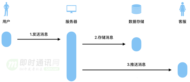 如图是一条消息发送的核心步骤,整个过程中可以分为两个部分,消息由客户端发送到服务端(第1、2步),服务端将消息推送至另一个客户端(第3步),发送过程中任何一步出现问题都会导致消息发送失败。