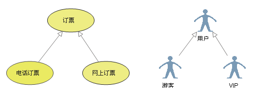 就是通常理解的继承关系,子用例和父用例相似,但表现出更特别的行为;子用例将继承父用例的所有结构、行为和关系。子用例可以使用父用例的一段行为,也可以重载它。父用例通常是抽象的。