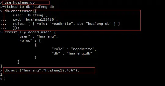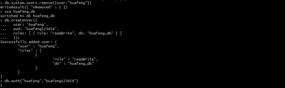 db.createUser({ user: 'huafeng', pwd: 'huafeng123456', roles: [ { role: "readWrite", db: "huafeng_db" } ] }); - 开启验证