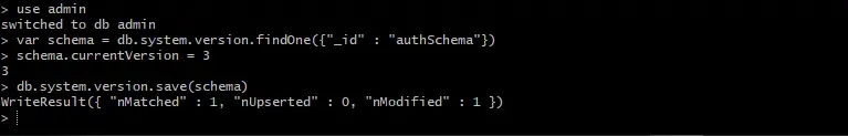 use admin; var schema = db.system.version.findOne({"_id" : "authSchema"}) schema.currentVersion = 3 db.system.version.save(schema)