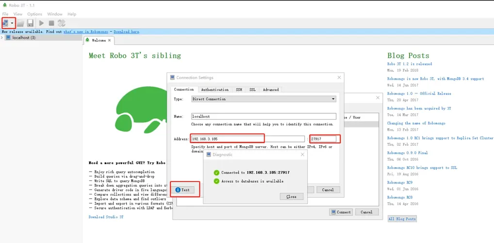 打开软件 点击左上角 创建一个连接配置,如图 地址写刚才docker对应的ip地址 端口号填写刚才配置的,点击Test按钮 如图提示,表明可连接mongo成功
