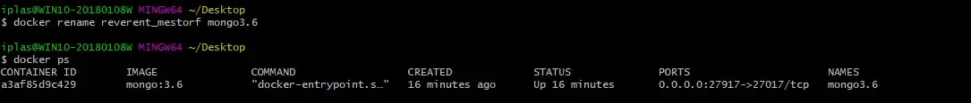 由于上面我们启动时没有指定名字,系统就自动生成一个随机的名字reverent_mestorf,为了方便记录,我们需要重新命名成我们想要的名字