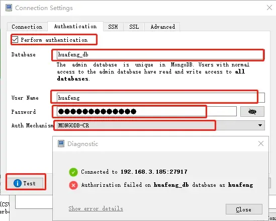 输入数据库名字,用户名,密码 以及验证方式为MONGODB-CR,点击Test按钮,提示验证失败