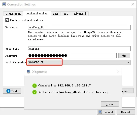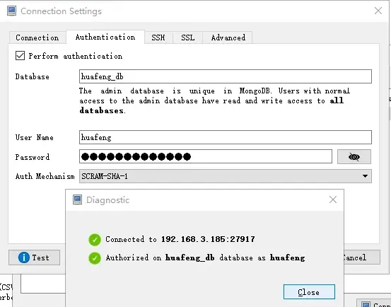 当我们把验证方式改为SCRAM-SHA-1时,却可以如图验证成功