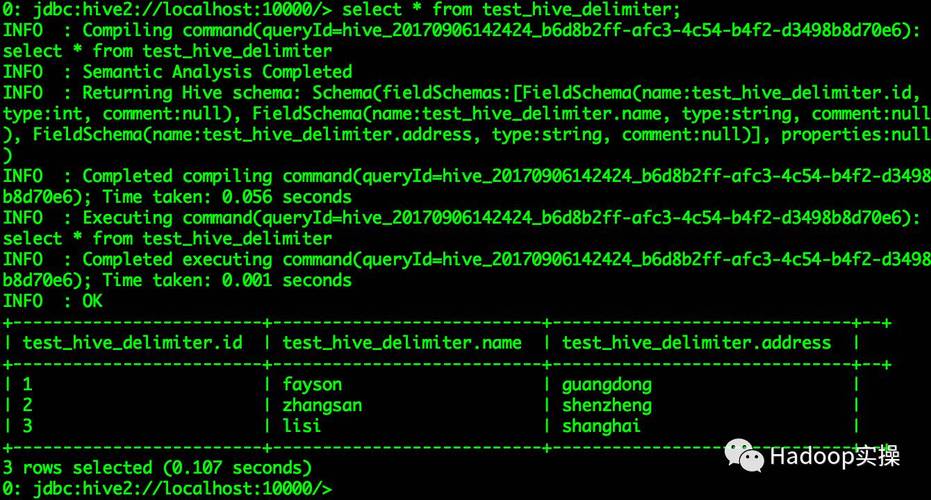 0: jdbc:hive2://localhost:10000/> select * from test_hive_delimiter; ... INFO : OK +-------------------------+---------------------------+------------------------------+--+ | test_hive_delimiter.id | test_hive_delimiter.name | test_hive_delimiter.address | +-------------------------+---------------------------+------------------------------+--+ | 1 | fayson | guangdong | | 2 | zhangsan | shenzheng | | 3 | lisi | shanghai | +-------------------------+---------------------------+------------------------------+--+ 3 rows selected (0.107 seconds) 0: jdbc:hive2://localhost:10000/>