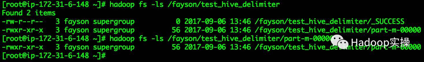 [root@ip-172-31-6-148 ~]# hadoop fs -ls /fayson/test_hive_delimiter Found 2 items -rw-r--r-- 3 fayson supergroup 0 2017-09-06 13:46 /fayson/test_hive_delimiter/_SUCCESS -rwxr-xr-x 3 fayson supergroup 56 2017-09-06 13:46 /fayson/test_hive_delimiter/part-m-00000 [root@ip-172-31-6-148 ~]# hadoop fs -ls /fayson/test_hive_delimiter/part-m-00000 -rwxr-xr-x 3 fayson supergroup 56 2017-09-06 13:46 /fayson/test_hive_delimiter/part-m-00000 [root@ip-172-31-6-148 ~]#
