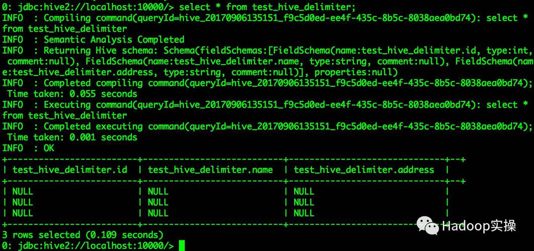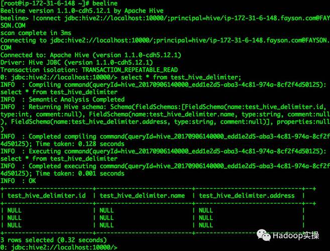 [root@ip-172-31-6-148 ~]# beeline Beeline version 1.1.0-cdh5.12.1 by Apache Hive beeline> !connect jdbc:hive2://localhost:10000/;principal=hive/ip-172-31-6-148.fayson.com@FAYSON.COM ... Transaction isolation: TRANSACTION_REPEATABLE_READ 0: jdbc:hive2://localhost:10000/> select * from test_hive_delimiter; ... INFO : OK +-------------------------+---------------------------+------------------------------+--+ | test_hive_delimiter.id | test_hive_delimiter.name | test_hive_delimiter.address | +-------------------------+---------------------------+------------------------------+--+ | NULL | NULL | NULL | | NULL | NULL | NULL | | NULL | NULL | NULL | +-------------------------+---------------------------+------------------------------+--+ 3 rows selected (0.287 seconds) 0: jdbc:hive2://localhost:10000/>