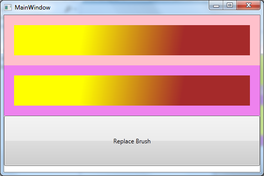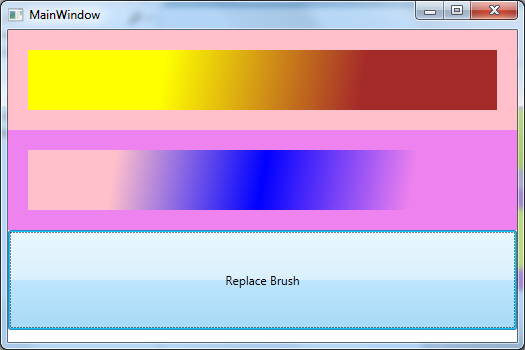 private void OnReplaceBrush(object sender, RoutedEventArgs e) { var brush = new LinearGradientBrush(); brush.GradientStops.Add(new GradientStop(Colors.Pink, 0.2)); brush.GradientStops.Add(new GradientStop(Colors.Blue, 0.5)); brush.GradientStops.Add(new GradientStop(Colors.Violet, 0.8)); this.Resources["brush1"] = brush; }