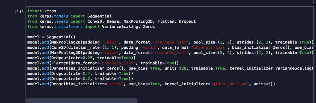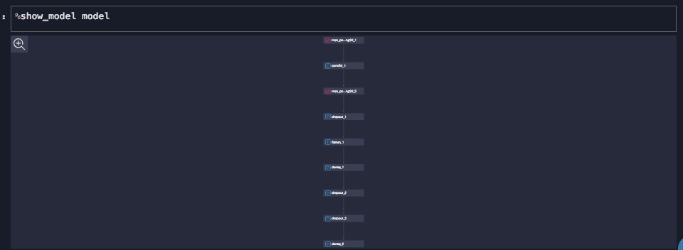 import keras from keras.models import Model from keras.models import Sequential from keras.layers import Conv2D, Dense, MaxPooling2D, Flatten, Dropout from keras.initializers import VarianceScaling, Zeros model = Sequential() model.add(MaxPooling2D(padding='valid', data_format='channels_last', pool_size=(2, 2), strides=(2, 2), trainable=True)) model.add(Conv2D(dilation_rate=(1, 1), padding='valid', data_format='channels_last', bias_initializer=Zeros(), use_bias=True, filters=64, strides=(1, 1), trainable=True, kernel_initializer=VarianceScaling(mode='fan_avg', seed=None, scale=1.0, distribution='uniform'), activation='relu', kernel_size=(3, 3))) model.add(MaxPooling2D(padding='valid', data_format='channels_last', pool_size=(2, 2), strides=(2, 2), trainable=True)) model.add(Dropout(rate=0.25, trainable=True)) model.add(Flatten(data_format='channels_last', trainable=True)) model.add(Dense(bias_initializer=Zeros(), use_bias=True, units=128, trainable=True, kernel_initializer=VarianceScaling(mode='fan_avg', seed=None, scale=1.0, distribution='uniform'), activation='relu')) model.add(Dropout(rate=0.4, trainable=True)) model.add(Dropout(rate=0.2)) 代码中构建了一个Sequential模型,模型对象是model,可以通过输入Magic Command 将代码转化成图