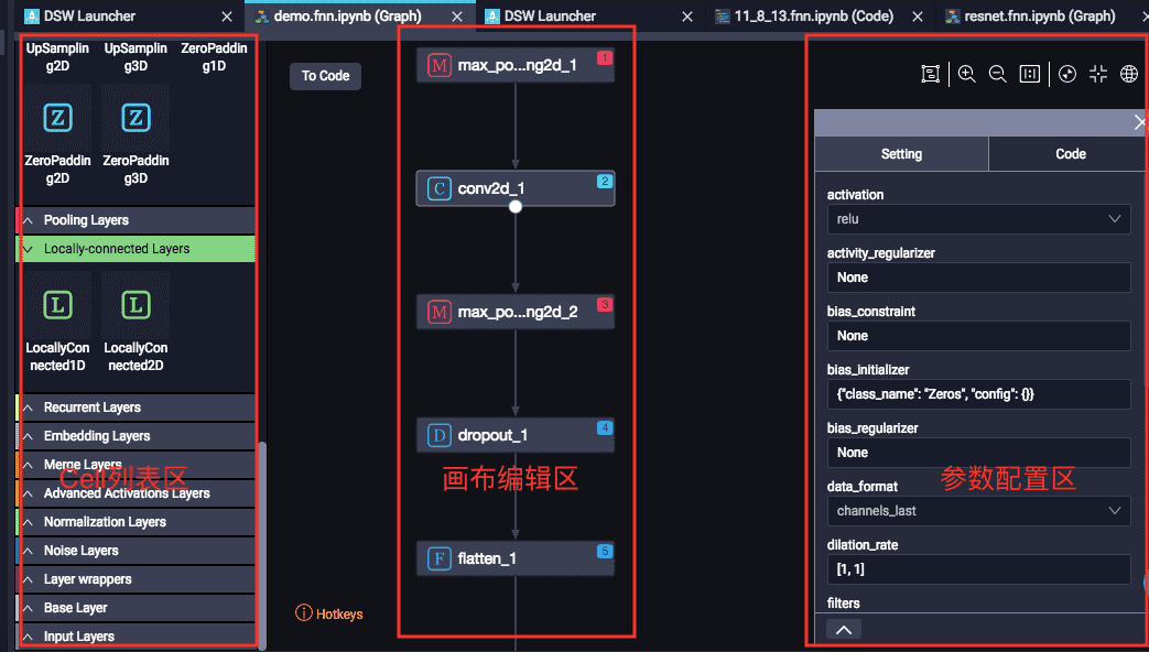 FNN功能实现了Keras的原生Cell向画布拖拽并且编辑的功能,画布分为Cell列表区,画布编辑区和参数配置区。