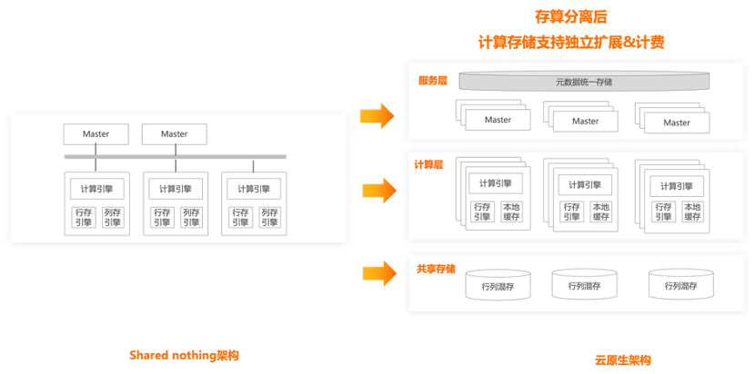 随着云原生的进一步演进,我们提供了全新的存算分离架构,将产品进一步拆分为服务层、计算层和共享存储层,架构图如下: