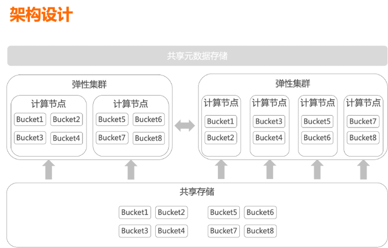 把数据根据hash bucket分成多个分片,按分片粒度在扩缩容的重新映射对象存储上的数据。如果扩容计算节点超过分片个数的时候,只能重分布数据。为了解决这个问题,我们支持hash bucket可以后台分裂和合并,避免重新分布数据。