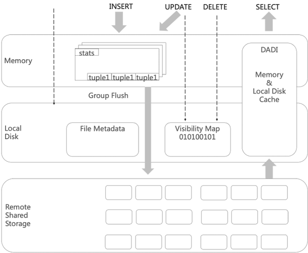 • 更新或者删除的时候,我们不需要直接修改OSS上面的数据,我们通过标记删除来实现,标记删除的信息也是保存在本地行存表中,我们通过visibility bitmap来存这个信息。标记删除会导致读的性能下降,我们通过后台merge来应用删除信息到文件,减少删除带来的读性能影响。