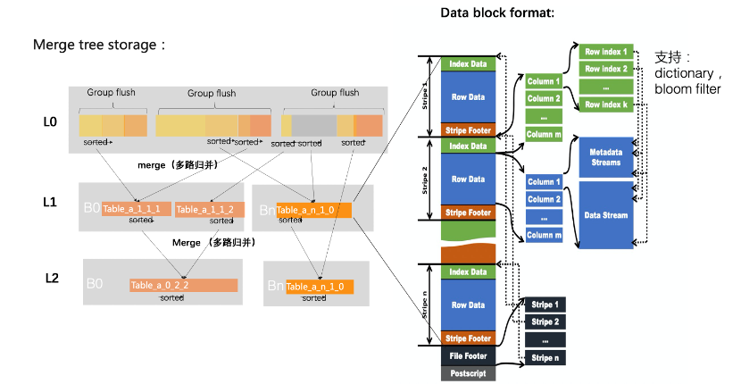 1.  Group flush:一批写入的数据,可以通过group flush写到同一个OSS文件,我们的OSS文件采用了ORC格式,不同bucket写入到对应strip;