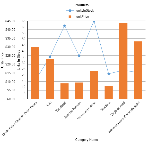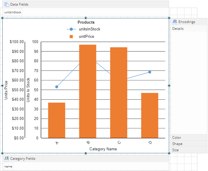 Let us see how to create chart with two plots. We already have a data source with Unit price, Units in stock, and category name fields.