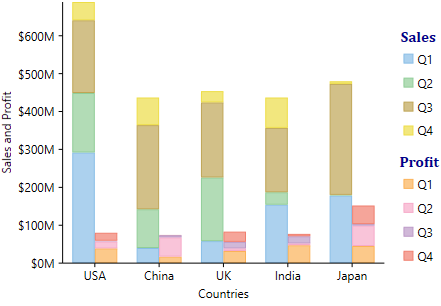 <Chart:C1FlexChart x:Name="flexChart" ItemsSource="{Binding DataContext.Data}" BindingX="Country" Stacking="Stacked"> <!--Grouping the legend items--> <Chart:Series SeriesName="Q1" Binding="SalesQ1" LegendGroup="Sales" StackingGroup="0" /> <Chart:Series SeriesName="Q1" Binding="ProfitQ1" LegendGroup="Profit" StackingGroup="1" /> <Chart:Series SeriesName="Q2" Binding="SalesQ2" LegendGroup="Sales" StackingGroup="0" /> <Chart:Series SeriesName="Q2" Binding="ProfitQ2" LegendGroup="Profit" StackingGroup="1" /> <Chart:Series SeriesName="Q3" Binding="SalesQ3" LegendGroup="Sales" StackingGroup="0" /> <Chart:Series SeriesName="Q3" Binding="ProfitQ3" LegendGroup="Profit" StackingGroup="1" /> <Chart:Series SeriesName="Q4" Binding="SalesQ4" LegendGroup="Sales" StackingGroup="0" /> <Chart:Series SeriesName="Q4" Binding="ProfitQ4" LegendGroup="Profit" StackingGroup="1" /> <Chart:C1FlexChart.AxisY> <Chart:Axis Format="$0M" Labels="True" Title="Sales and Profit"/> </Chart:C1FlexChart.AxisY> <Chart:C1FlexChart.AxisX> <Chart:Axis Title="Countries"/> </Chart:C1FlexChart.AxisX> <!--Styling the legend group headers--> <Chart:C1FlexChart.LegendGroupHeaderStyle> <Chart:ChartStyle Stroke="DarkBlue" FontFamily="Cambria" FontStyle="Normal" FontSize="15" FontWeight="Bold"/> </Chart:C1FlexChart.LegendGroupHeaderStyle> </Chart:C1FlexChart>