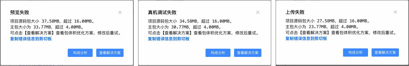 在预览(或真机调试、或上传)时遇到关于包体积超限时的错误提示弹窗中,也可以点击构成分析按钮,对项目进行构成分析。
