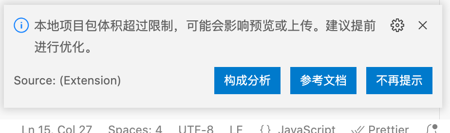 此外,在平时的开发中,如果项目的包体积超限,可能会在右下角出现提醒,此时可以提前对项目文件内容展开优化。