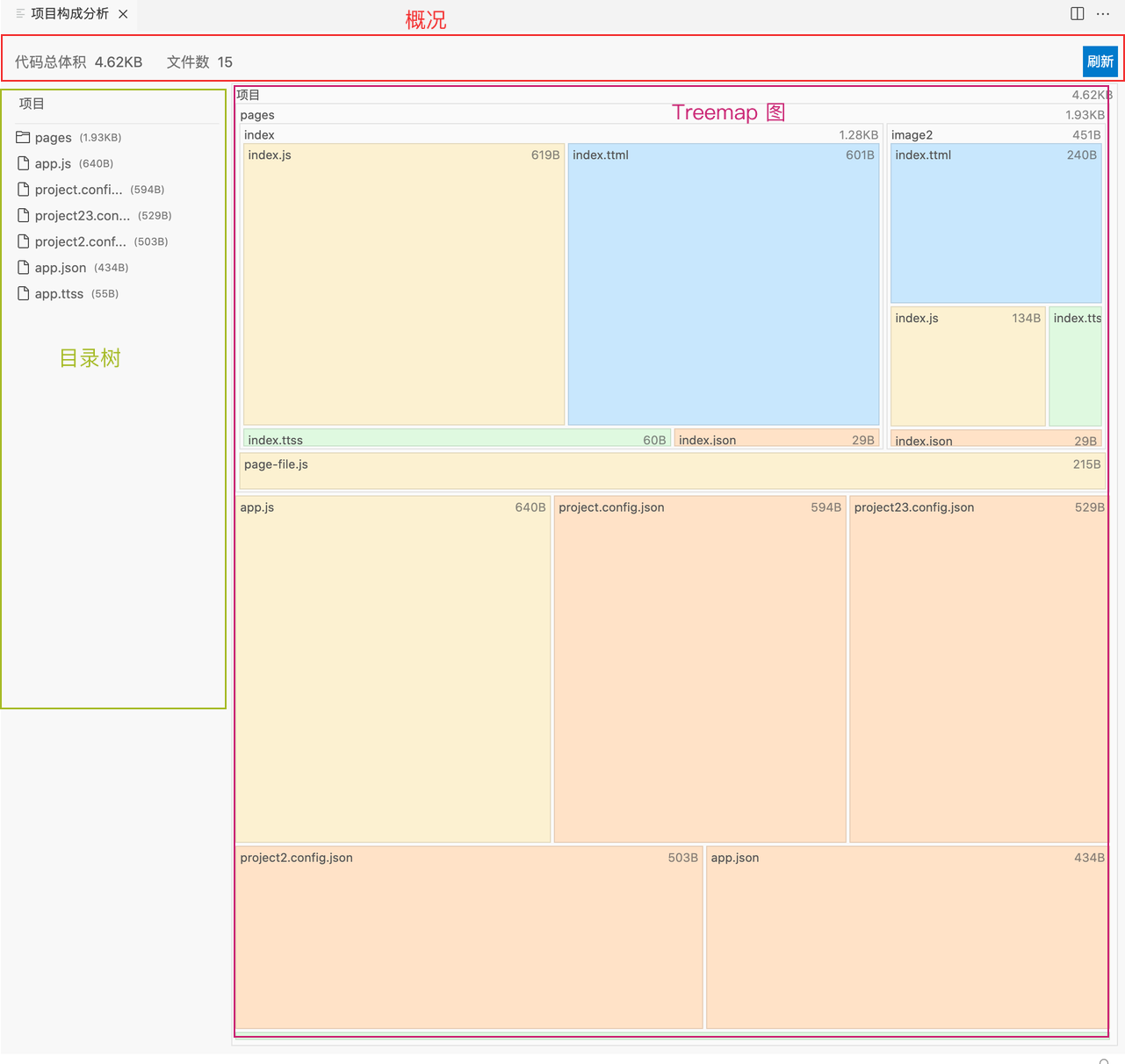 - 最上面是概况,展示总体积和文件总数。右边的刷新按钮会以项目根目录,重新展示项目构成。