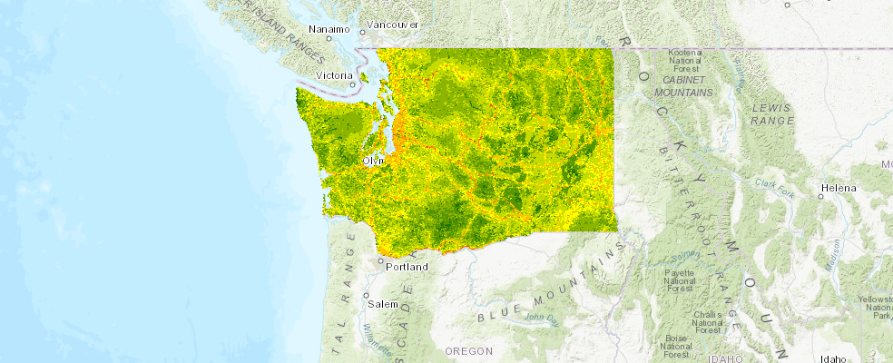 # Import the geocode function from arcgis.geocoding import geocode # Use geocoding to get the location of the study area in the spatial reference of the input data for the analysis. study_area_gcd = geocode(address='State of Washington, USA', out_sr=hmna_item.layers[0].properties["spatialReference"]) # Get the geographic extent of the study area. # This extent will be used for displaying the input data and output results. study_area_extent = study_area_gcd[2]['extent'] study_area_extent{'xmin': -2013071.8299284552, 'ymin': 731378.0004306352, 'xmax': -1447643.6537916327, 'ymax': 1487237.9811118357}Preview the analysis data