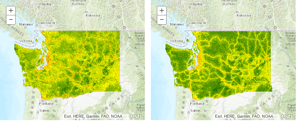 # Search for the persistent analysis result that was generated via Raster Analytics on the GIS. search_persistent_result = gis.content.search(query="title:NaturalAndAccessible_WashingtonState")[0] search_persistent_result# Create a map to display the persistent analysis result in a map map1 = gis.map('State of Washington, USA') map1.content.add(search_persistent_result) # Create a map to display the dynamic analysis result in another map. map2 = gis.map('State of Washington, USA') map2.content.add(result_weighted_overlay)map1