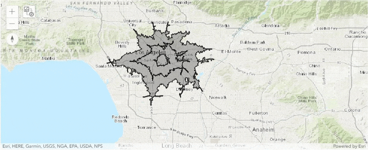 LA_fset_list=[] for result in sa_results: poly_feat_list = [] for polygon_dict in result['saPolygons']['features']: f1 = Feature(polygon_dict['geometry'], polygon_dict['attributes']) poly_feat_list.append(f1) service_area_fset = FeatureSet(poly_feat_list, geometry_type=result['saPolygons']['geometryType'], spatial_reference= result['saPolygons']['spatialReference']) LA_fset_list.append(service_area_fset)Draw and animate the results on a map