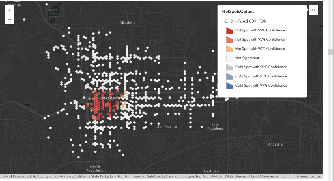 collision_hot_spots = find_hot_spots(collisions, output_name='collision_hexagon_hot_spots' + str(dt.now().microsecond), shape_type='hexagon')collision_hot_spotsm3 = gis.map('Pasadena, California') m3.basemap.basemap = 'arcgis-dark-gray' m3