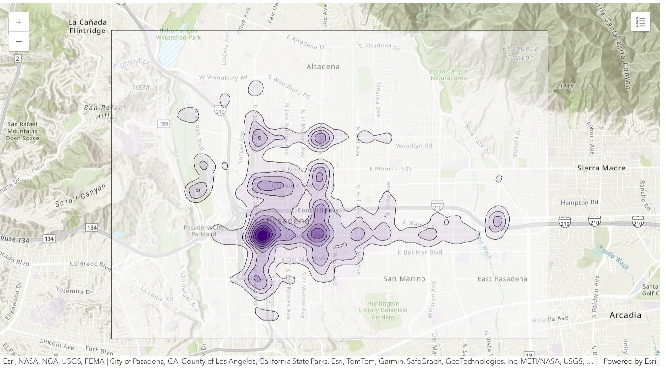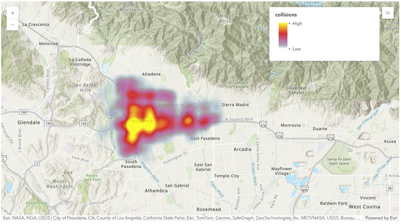 Like the calculate_density, the HeatmapRenderer indicates a high density of accidents in central Pasadena. However, the heat map particularly emphasizes the area south of the Foothill Freeway, corresponding to downtown.