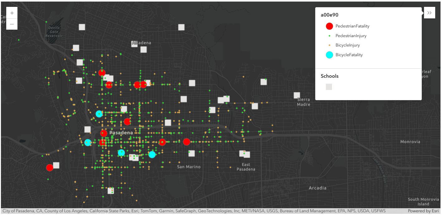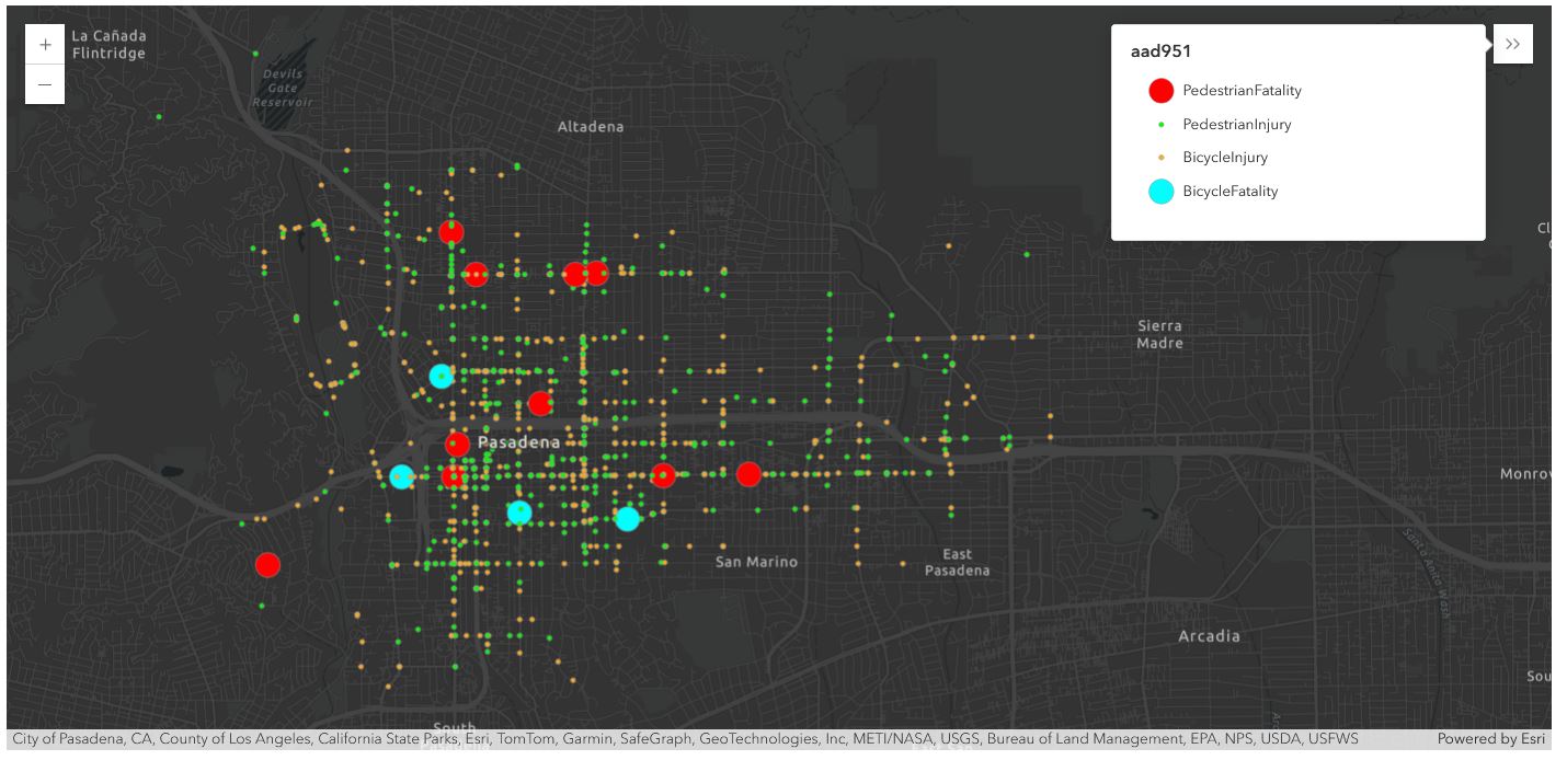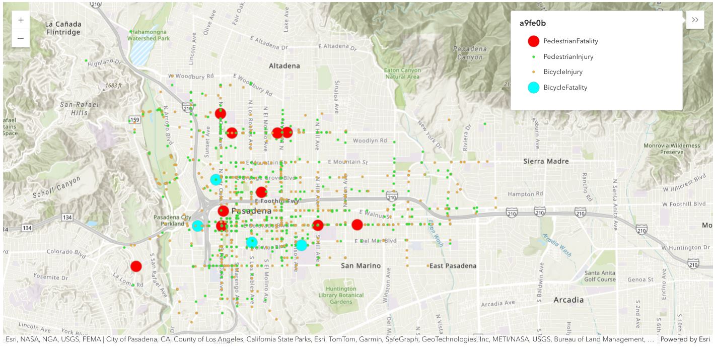 print(unique_value_list)[{'label': 'PedestrianFatality', 'symbol': SimpleMarkerSymbolEsriSMS(angle=None, color=[255, 0, 0, 255], outline=SimpleLineSymbolEsriSLS(color=[153, 153, 153, 255], marker=None, style='esriSLSSolid', type='esriSLS', width=0.375), size=15, style='esriSMSCircle', type='esriSMS', xoffset=None, yoffset=None), 'value': 'PedestrianFatality'}, {'label': 'PedestrianInjury', 'symbol': SimpleMarkerSymbolEsriSMS(angle=None, color=[0, 255, 0, 255], outline=SimpleLineSymbolEsriSLS(color=[153, 153, 153, 255], marker=None, style='esriSLSSolid', type='esriSLS', width=0.375), size=3, style='esriSMSCircle', type='esriSMS', xoffset=None, yoffset=None), 'value': 'PedestrianInjury'}, {'label': 'BicycleInjury', 'symbol': SimpleMarkerSymbolEsriSMS(angle=None, color=[255, 172, 28, 255], outline=SimpleLineSymbolEsriSLS(color=[153, 153, 153, 255], marker=None, style='esriSLSSolid', type='esriSLS', width=0.375), size=3, style='esriSMSCircle', type='esriSMS', xoffset=None, yoffset=None), 'value': 'BicycleInjury'}, {'label': 'BicycleFatality', 'symbol': SimpleMarkerSymbolEsriSMS(angle=None, color=[0, 255, 255, 255], outline=SimpleLineSymbolEsriSLS(color=[153, 153, 153, 255], marker=None, style='esriSLSSolid', type='esriSLS', width=0.375), size=15, style='esriSMSCircle', type='esriSMS', xoffset=None, yoffset=None), 'value': 'BicycleFatality'}] accident_renderer = renderers.UniqueValueRenderer( valueExpression = arcade_expression, unique_value_infos = unique_value_list)m5 = gis.map('Pasadena, California') m5.basemap.basemap = 'topo-vector' m5