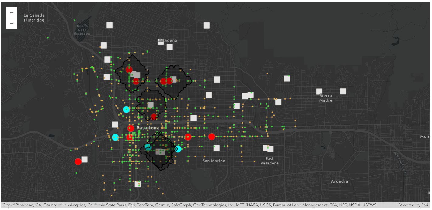 When it comes to policy decisions, hot spots and heat maps don't provide much context and make no explicit claims about the data. Because your subject is not only accidents but accidents near schools, we will add a layer of Pasadena Unified School District (PUSD) schools to our map. Then, we will find areas within a half-mile walking distance of each school.