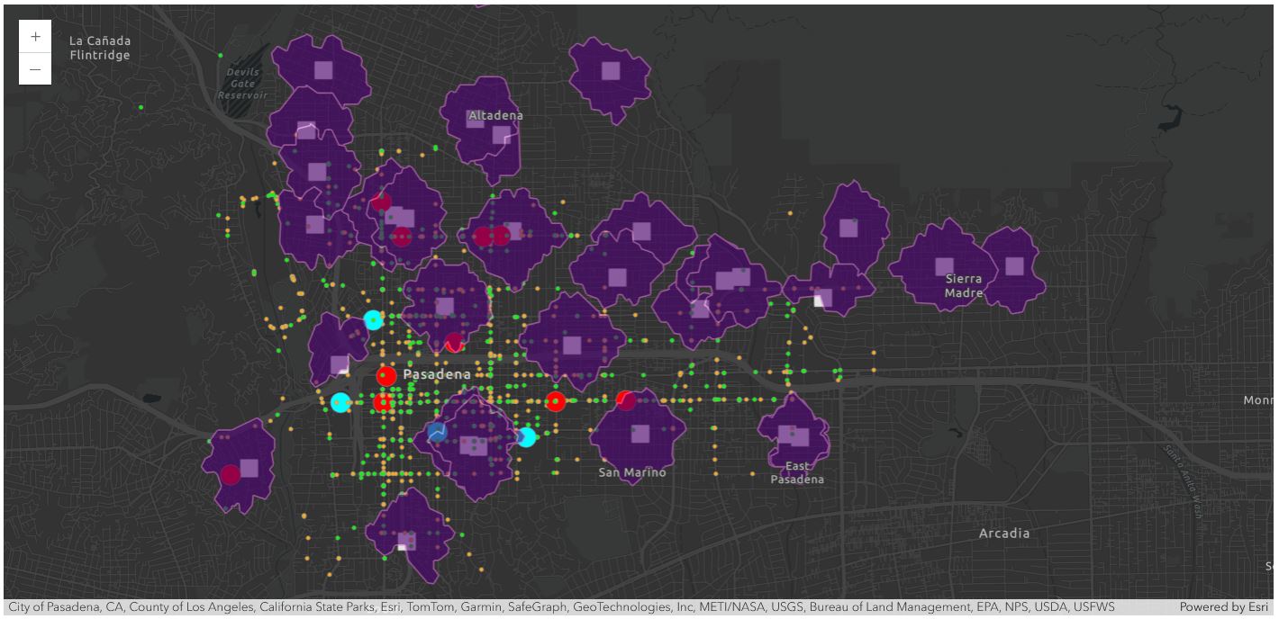 walk_dist_from_schools = create_drive_time_areas(schools.layers[0], break_values=[0.5], break_units='Miles', travel_mode='Walking Distance', output_name='psud_schools_drivetime' + str(dt.now().microsecond))walk_dist_from_schoolsm8 = gis.map('Pasadena, California') m8.basemap.basemap = 'arcgis-dark-gray' m8