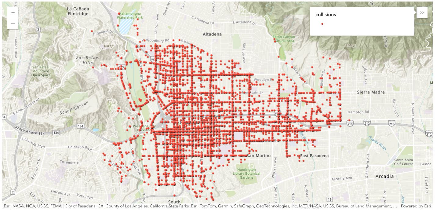 collisions = item.layers[0]m1 = gis.map('Pasadena, California') m1.basemap.basemap = 'topo-vector' m1