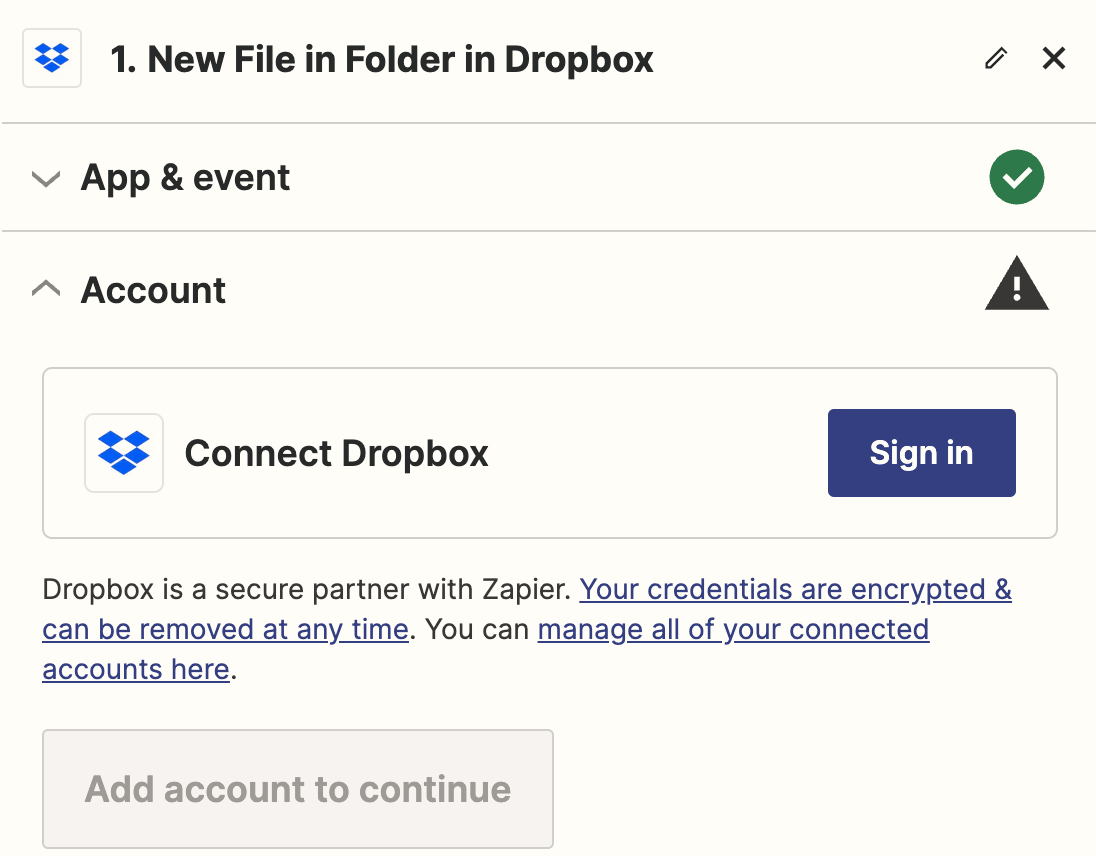 Configure the trigger with your chosen integration (Amazon S3, Dropbox, etc.). Integrations may use OAuth to authenticate automatically, or you may have to enter an API key.