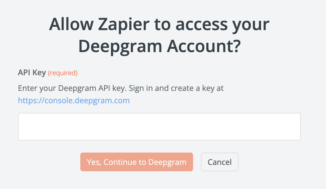 Deepgram’s Zapier integration only accepts a publicly accessible URL audio file. If you need to convert raw audio to a URL, we recommend using the Cloud Convert integration to convert the audio file to a URL.