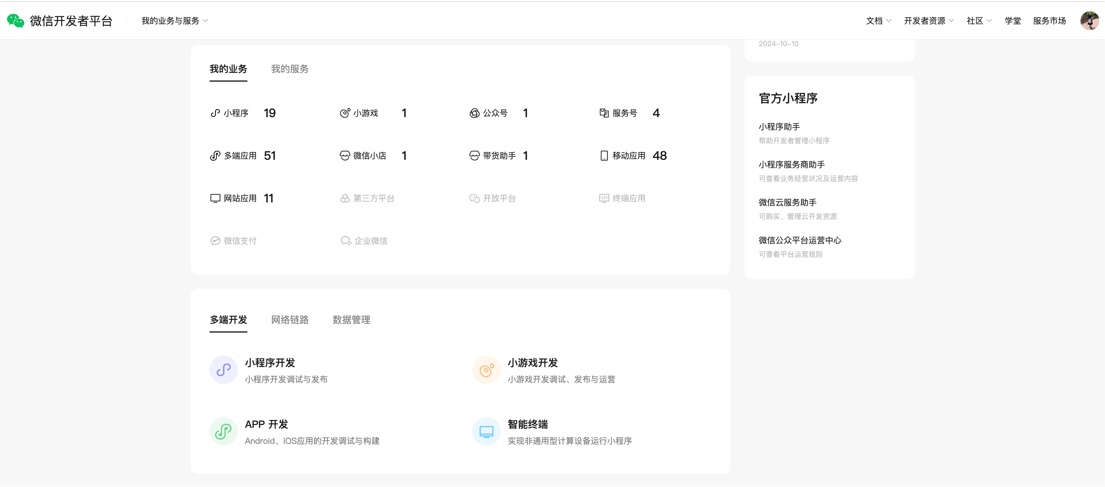 为帮助开发者可以全局的管理所负责的所有微信生态业务,开发者平台支持使用微信扫码登录,登录后即可在开发者平台内管理当前微信用户作为管理员或者开发者的微信生态的业务,具体包含:小程序、小游戏、公众号、服务号、小程序、小游戏、小店、小店带货助手、移动应用、网站应用、第三方平台、多端应用、微信网关,后续将接入更多业务,如开放平台、视频号助手以及联盟带货机构等。