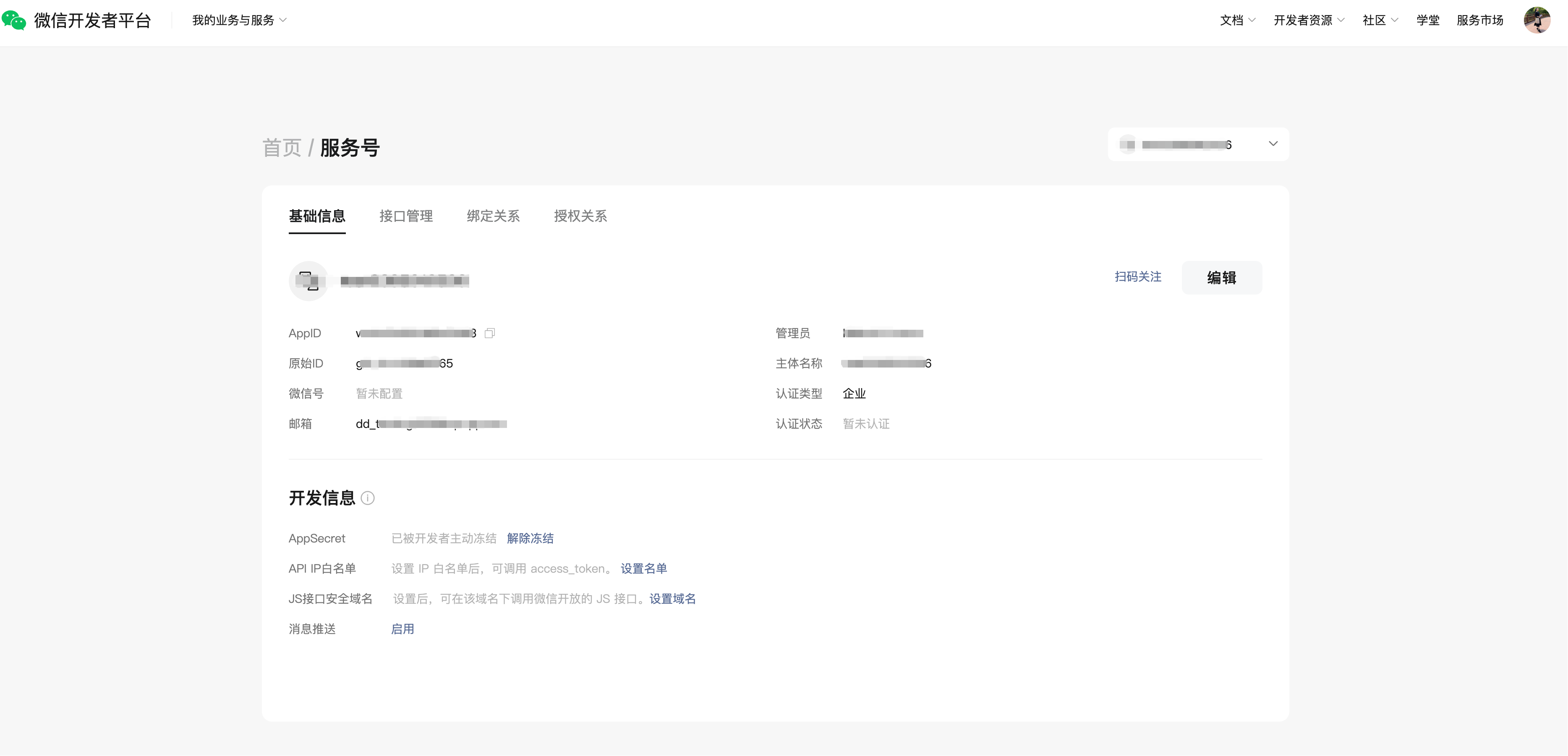 开发者可在业务详情页中可进行该账号的基础信息、开发信息管理,可对接口进行监控和告警管理,可对各种绑定关系和第三方授权进行管理。各个业务对应的功能操作可在文档目录中查看对应的介绍文档。