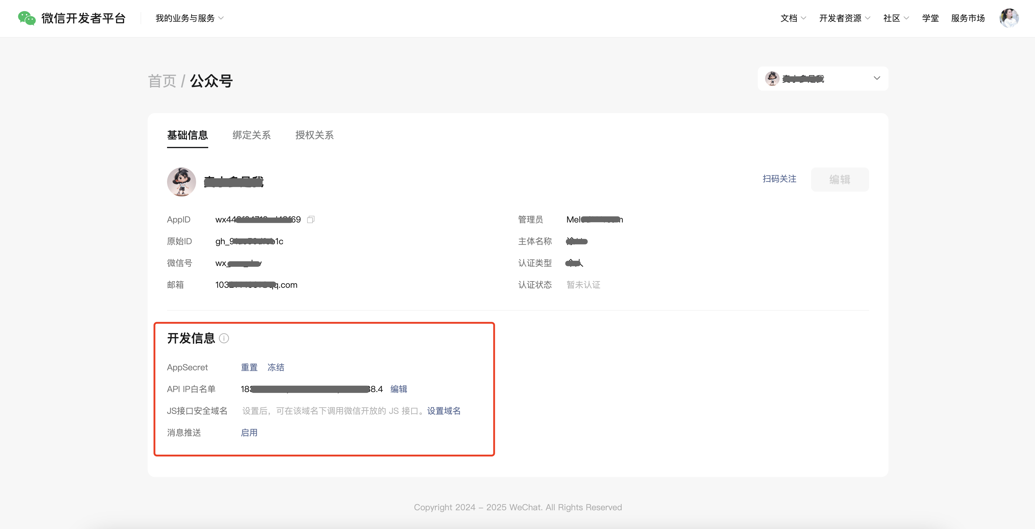 其中开发者可在此处直接修改 AppSecret 、API IP 白名单信息、JS接口安全域名以及消息推送的配置(不同业务的设置信息会有不同)