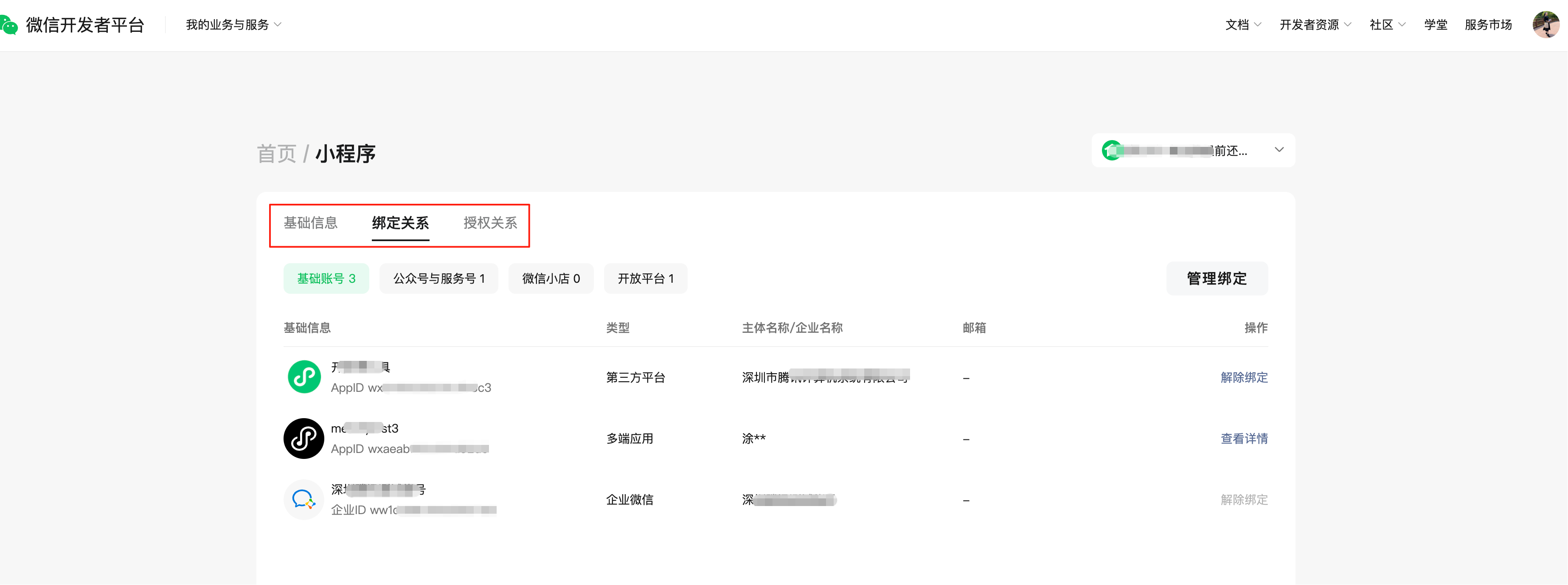开发者可在微信公众平台管理小程序与小游戏,亦可在微信开发者平台进行基础信息、开发信息、绑定关系的查看,以及管理授权关系。