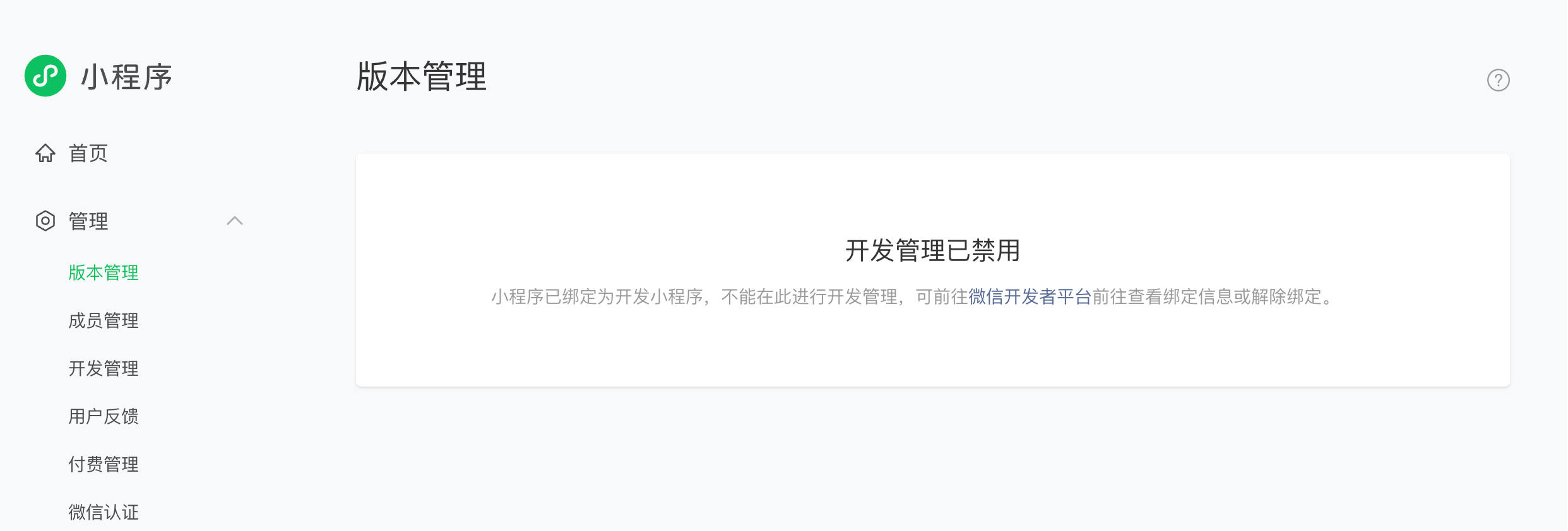 对于已经绑定为「第三方平台开发小程序」的小程序账号,在微信公众平台中将无法使用版本管理功能,如下截图: