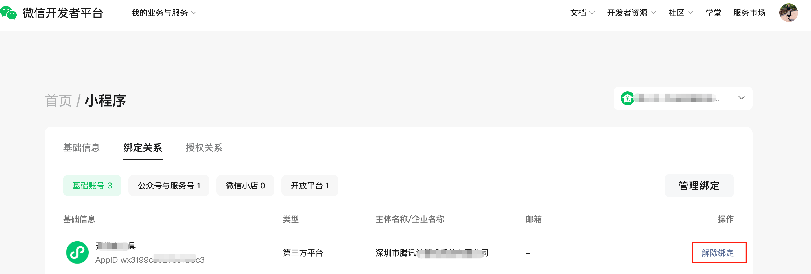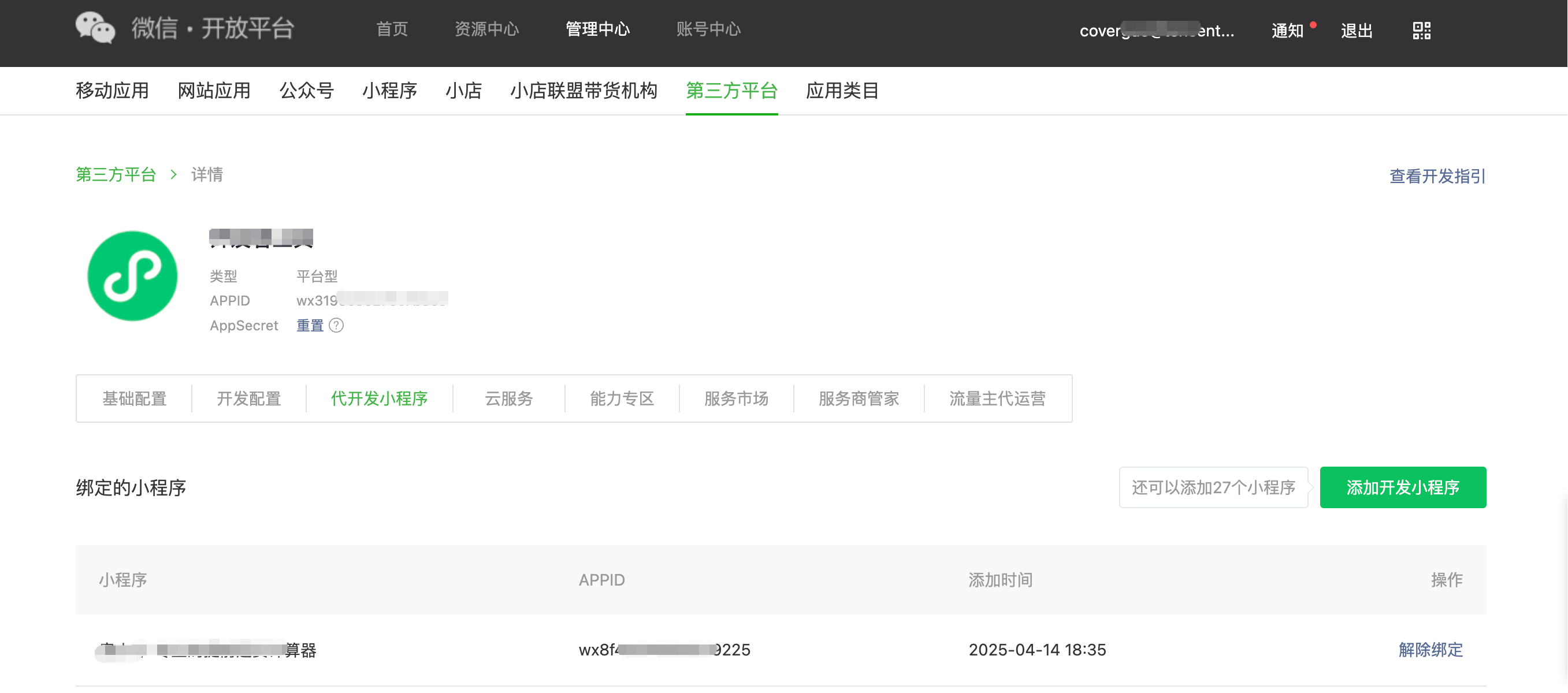 此时,开发者可联系第三方平台管理员,前往「微信开放平台 - 管理中心 - 第三方平台 - 代开发小程序 - 绑定的小程序」解除绑定