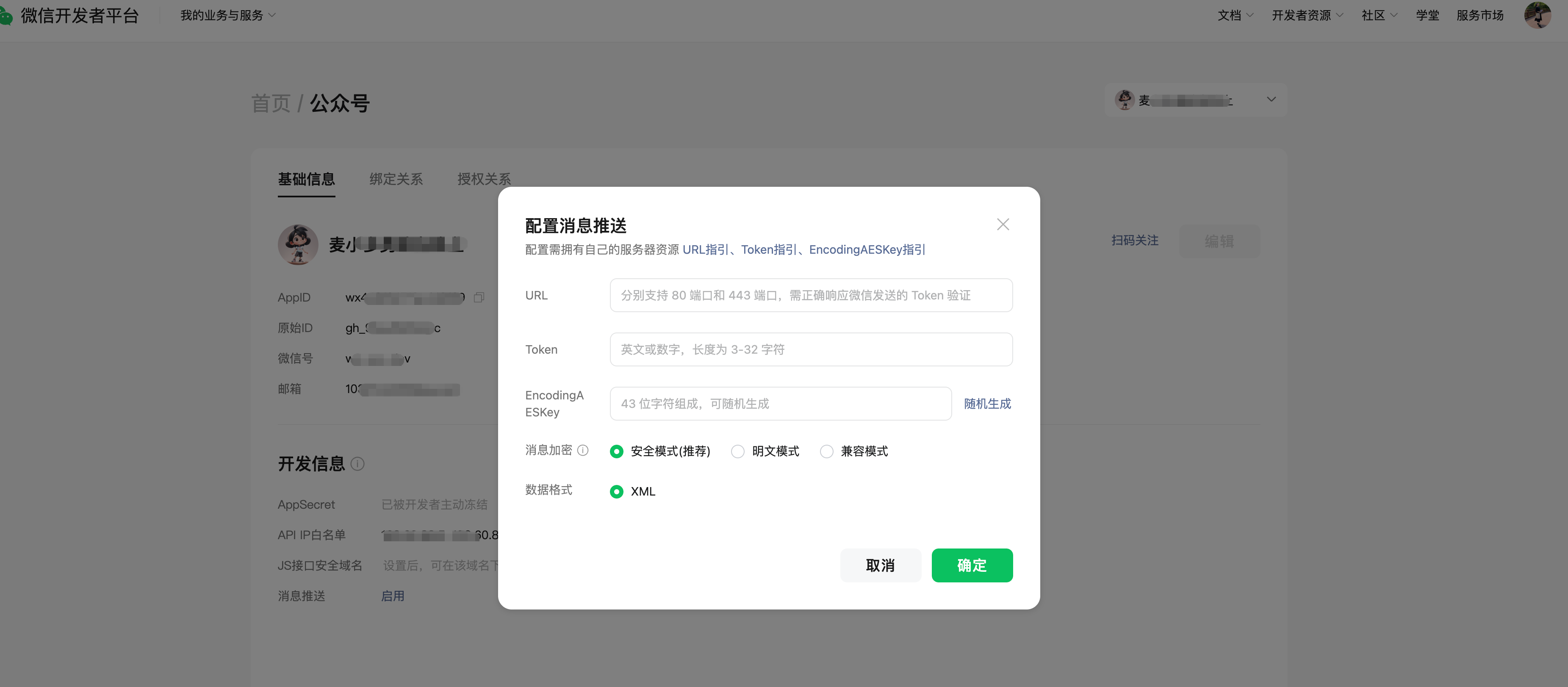 可在「微信开发者平台 - 我的业务 - 公众号 - 消息与事件推送」处进行配置。即,填写服务器地址(URL)、Token和EncodingAESKey,其中URL是开发者用来接收微信消息和事件的接口URL。Token可由开发者可以任意填写,用作生成签名(该Token会和接口URL中包含的Token进行比对,从而验证安全性)。EncodingAESKey由开发者手动填写或随机生成,将用作消息体加解密密钥。