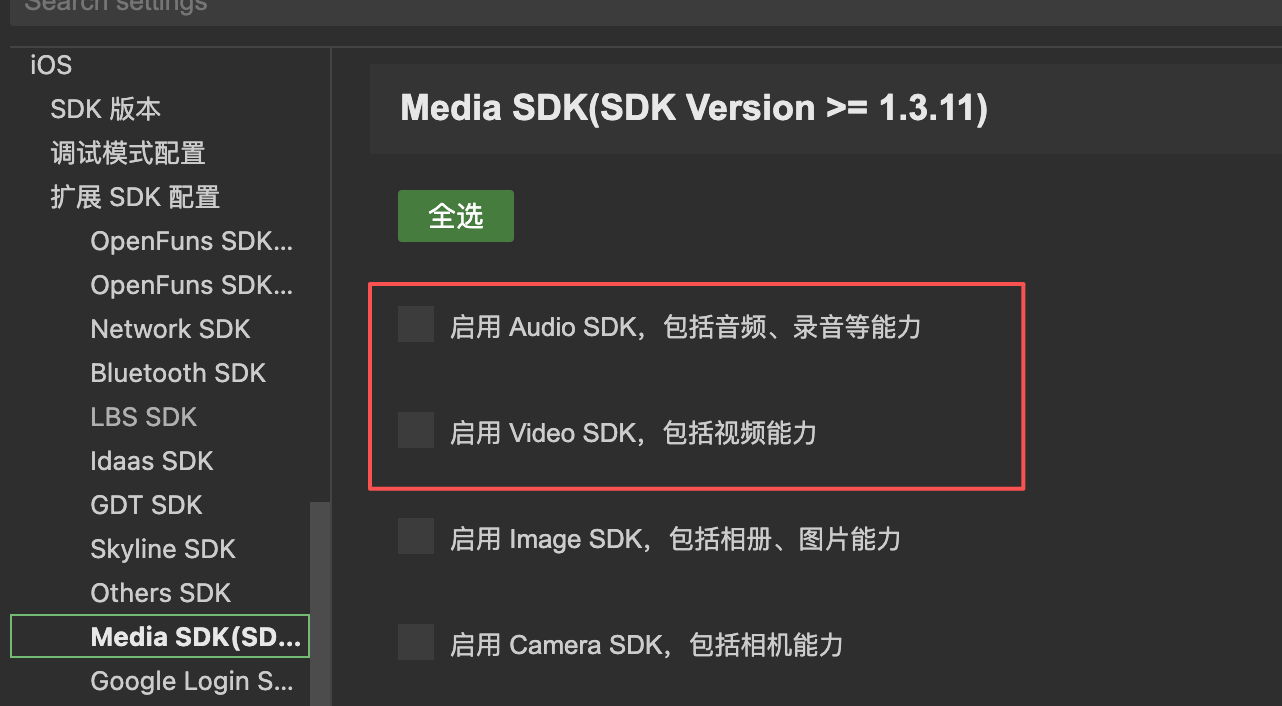 - iOS 端使用该组件,依赖 video 和 audio 这两个扩展 SDK,都需要勾上